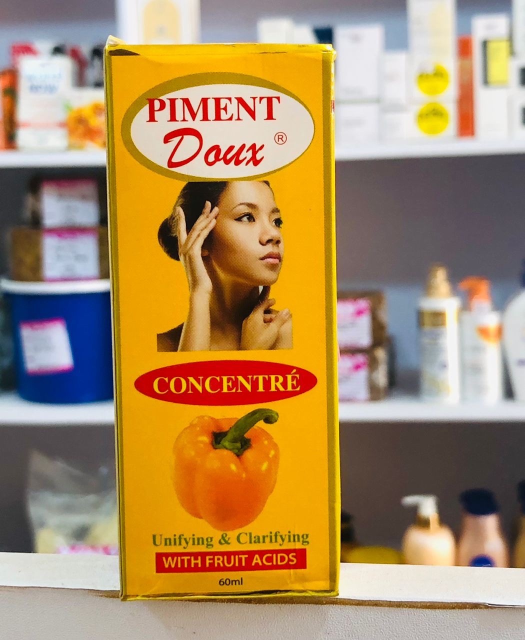 Piment Doux Concentré is a powerful, concentrated lightening serum, often enriched with fruit acids, designed to remove stubborn dark spots, acne scars, and blemishes. It effectively brightens skin tone and targets dark areas such as knuckles, knees, elbows, and inner thighs.
